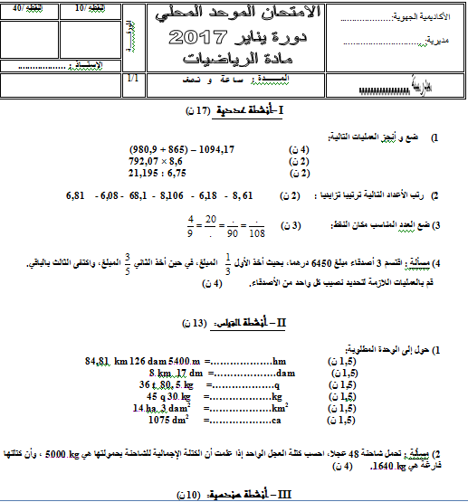 نموذج امتحان موحد محلي على صعيد المؤسسة في مادة الرياضيات للسنة السادسة من التعليم الإبتدائي دورة يناير للسنة السابقة / الماضية مصحوبة بالأجوبة
